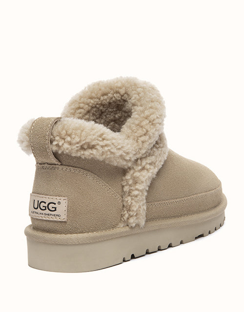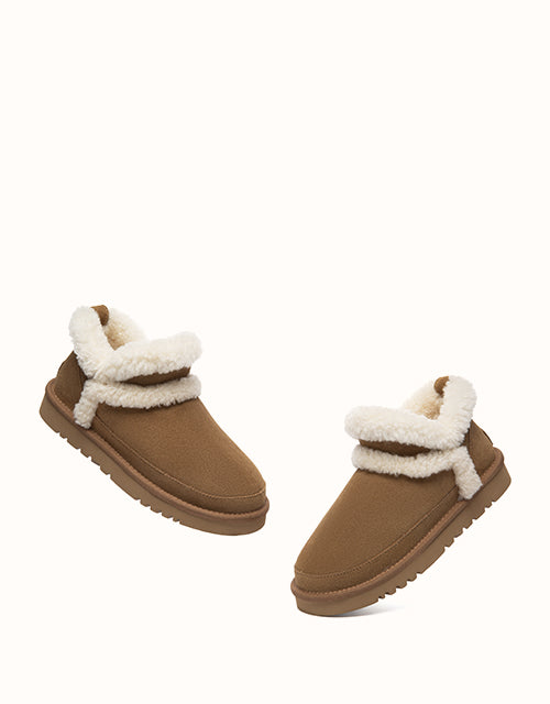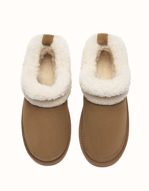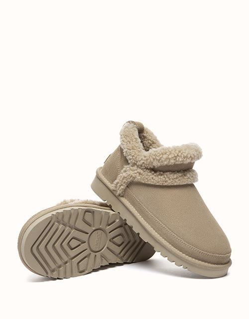 The AUSTRALIAN SHEPHERD® Arden Sheepskin Wool Slippers offer soft, winter-ready comfort in a minimal ankle design. Made from breathable cow suede with a plush sheepskin wool lining, they keep feet warm, cushioned, and dry all day. Finished with a fold-over wool collar and lightweight sole, this cosy style slips on easily for everyday indoor or outdoor wear.