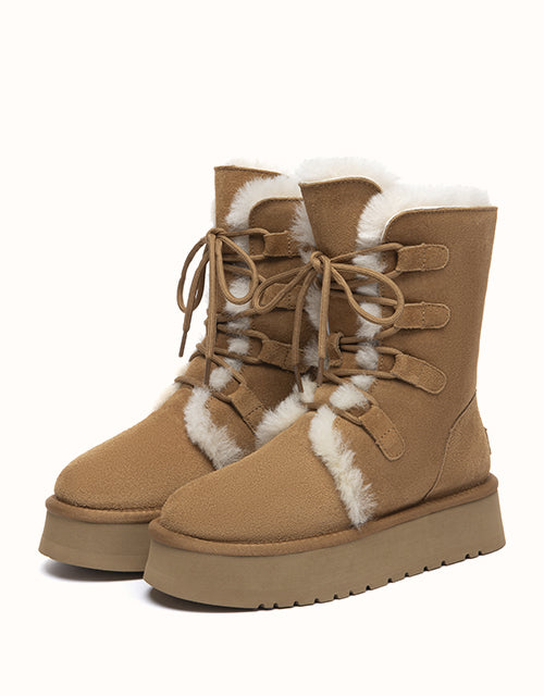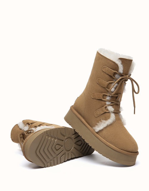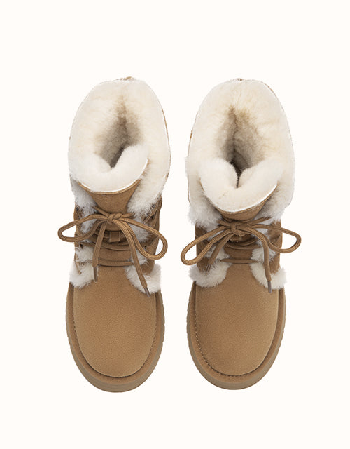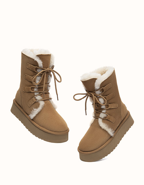 A cosy lace-up design crafted from premium cow suede and plush wool lining for natural warmth. The mid-calf height offers extra coverage, while the lightweight EVA sole ensures everyday comfort. Finished with an easy-care surface in a classic Chestnut shade that pairs effortlessly with any winter wardrobe.