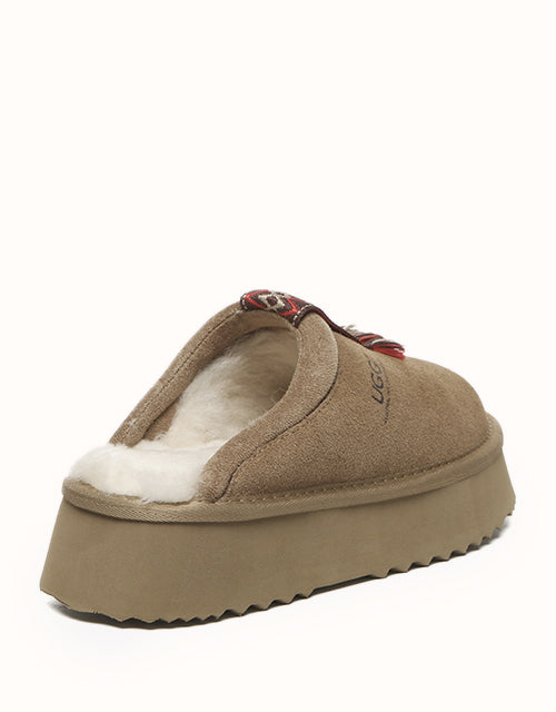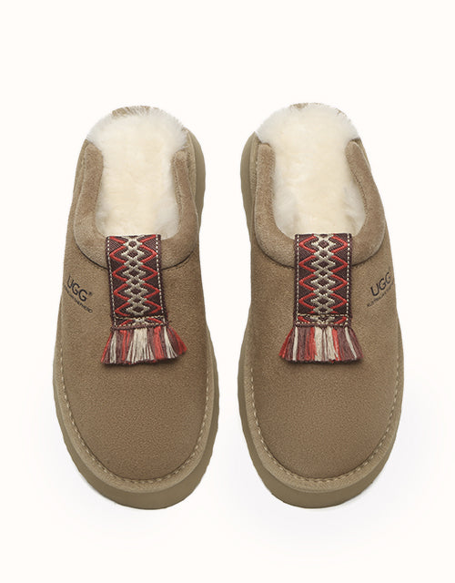 Crafted with meticulous attention to detail, these shoes feature a Fair Isle-inspired geometric jacquard design adorned with colorful tassels, exuding a timeless British charm. Made from premium Australian Merino sheepskin, they provide unparalleled softness, warmth, and all-day comfort. The lightweight EVA platform sole adds a touch of height while ensuring cushioned support and stability, delivering a perfect balance of function and elegance with every step.