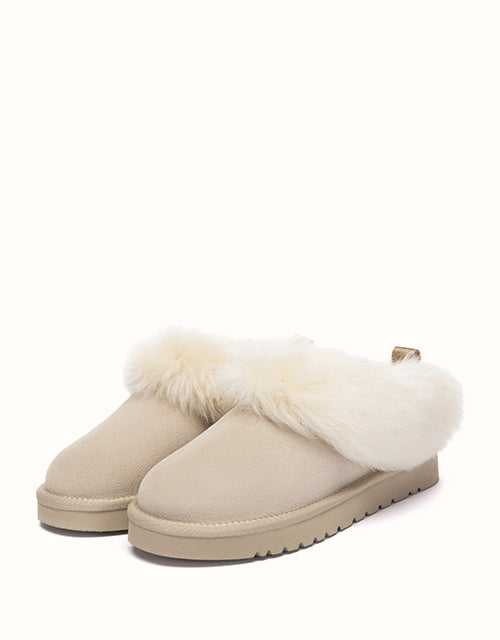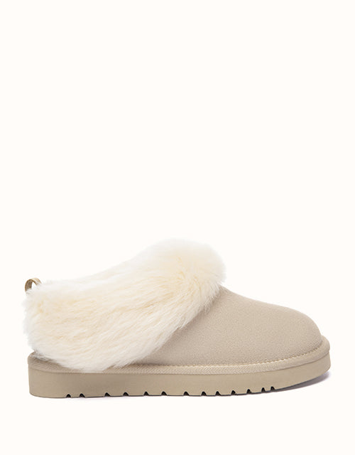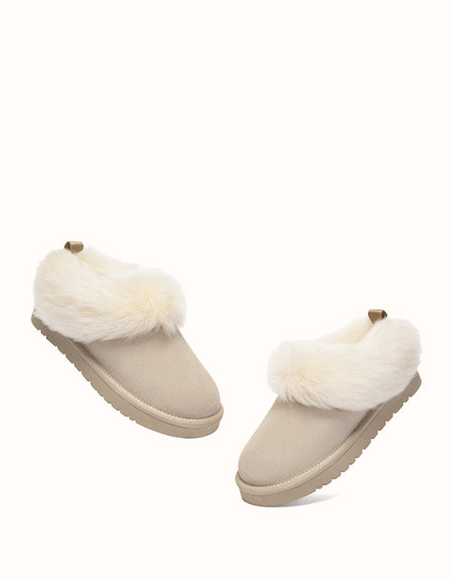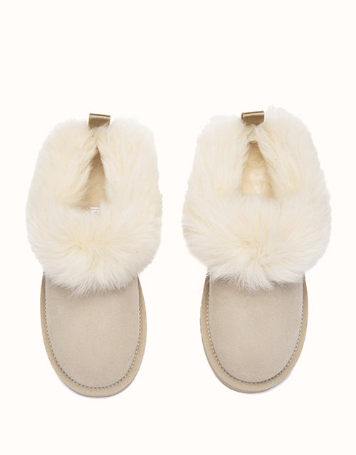 The Mianee Ankle Slippers offer cosy comfort in a soft, relaxed silhouette. Crafted from smooth cow suede and fully lined with plush sheepskin wool, they provide natural warmth with breathable comfort. The fluffy wool collar adds a gentle finishing touch, while the lightweight EVA sole ensures stable support for everyday lounging at home.