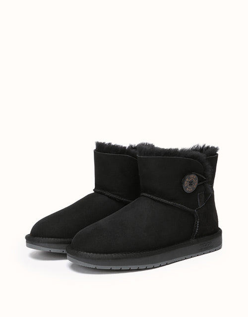 A mini wood button with logo stamp compliments exposed fur with traditional double face sheepskin which has a special molecular structure that allows the material to absorb excessive moisture, and always keep your feet warm and dry. The boots can be paired with jeans and a jacket or with a sundress during summer.