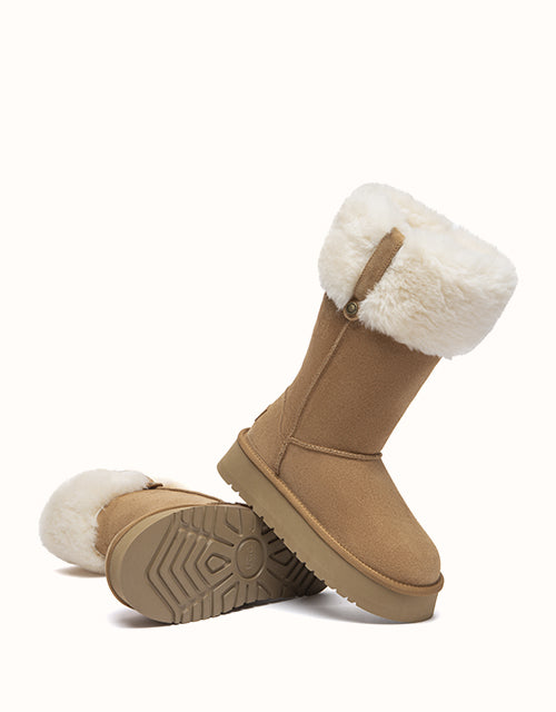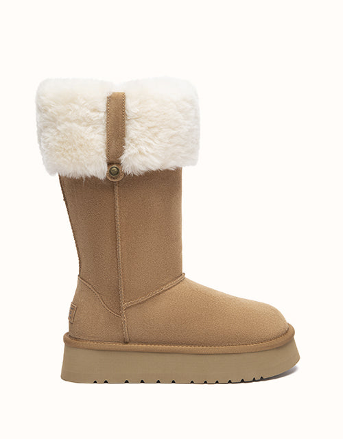 The Eleny Tall UGG Boots deliver classic winter warmth in a refined, tall silhouette. Crafted from smooth cow suede and fully lined with plush sheepskin wool, they provide natural insulation with soft, breathable comfort. Finished with a cosy wool collar and a lightweight EVA sole, this pair offers everyday support for cold-weather wear.