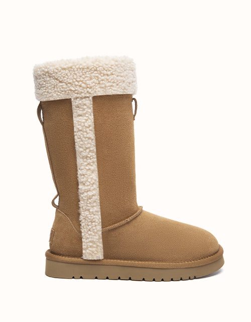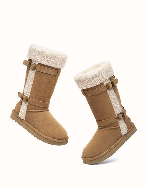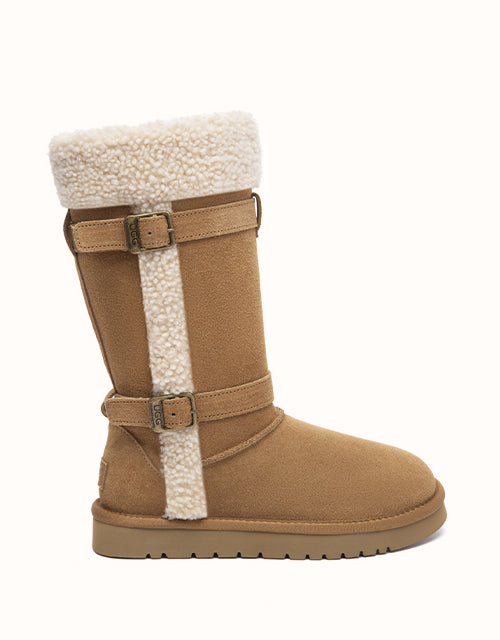 Soft cow suede and plush sheepskin wool come together in the Nordel Tall UGG Boots, delivering consistent warmth from foot to calf. The tall, clean silhouette is finished with subtle belted detailing and a lightweight EVA sole, making them an easy, reliable choice for winter days.