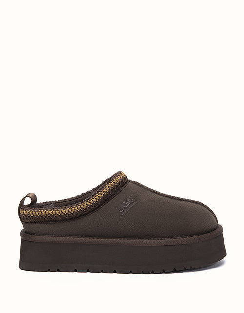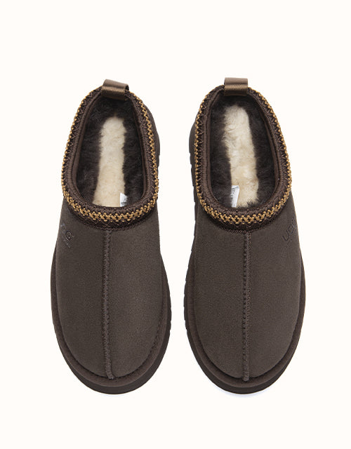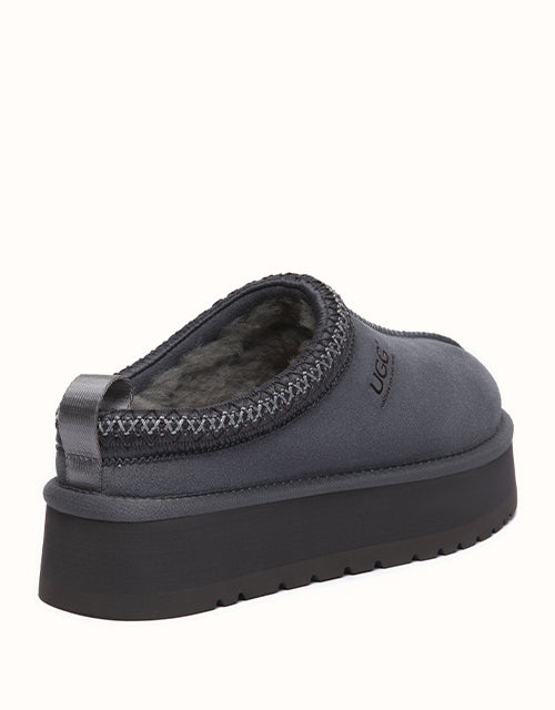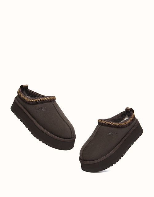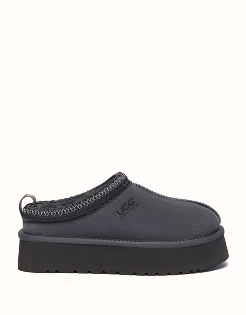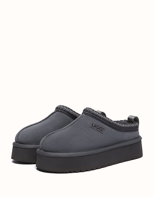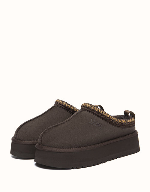 Experience everyday luxury with the Australian Shepherd Tay Platform Ugg Slippers. Crafted from breathable cow suede and lined with ultra-soft sheepskin wool, they deliver lasting comfort and warmth. A lightweight EVA rubber sole offers durability and grip, while the versatile colour range makes them perfect for any style.