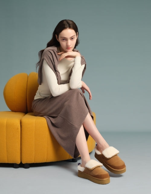 Step into warmth and comfort with the Australian Shepherd Theia Platform Slippers. Made with premium sheepskin for added coziness during chilly days and designed with a convenient slip-on style for effortless wear. Available in chestnut and sand, making it easy to complement your personal style and wardrobe. The platform sole adds a stylish lift, perfect for enhancing a variety of outfits.
