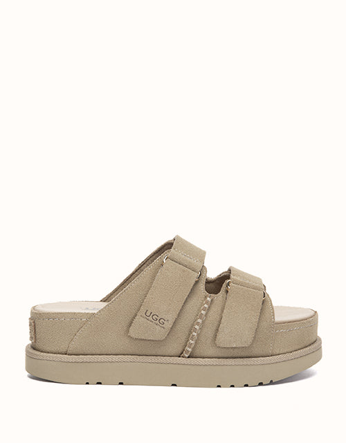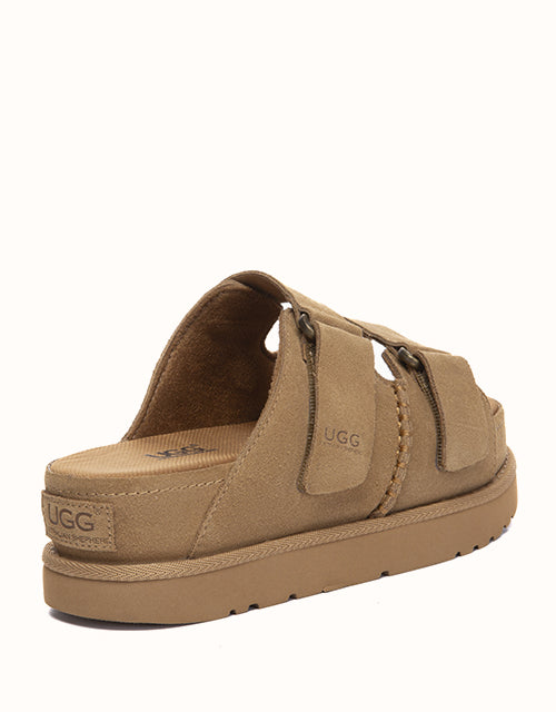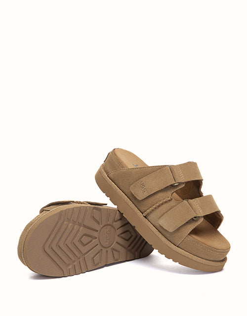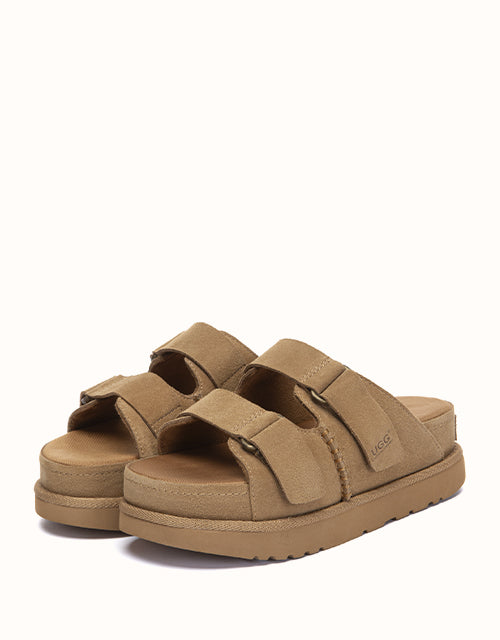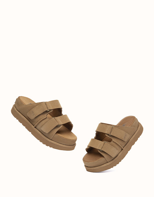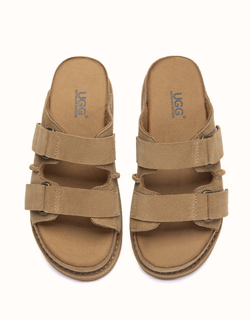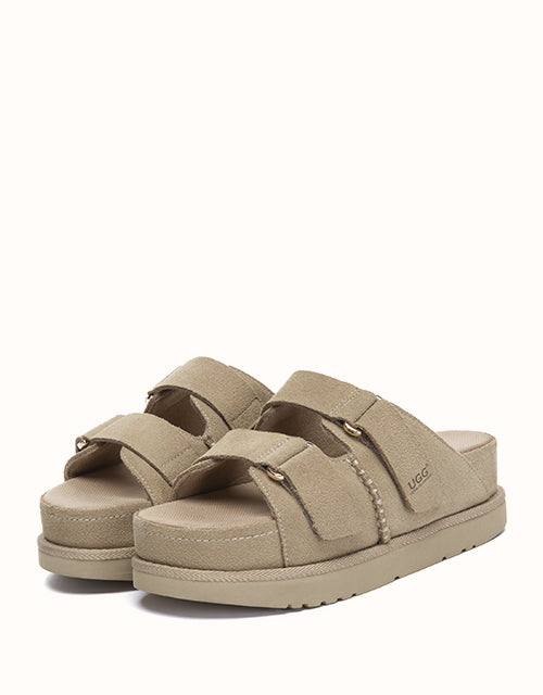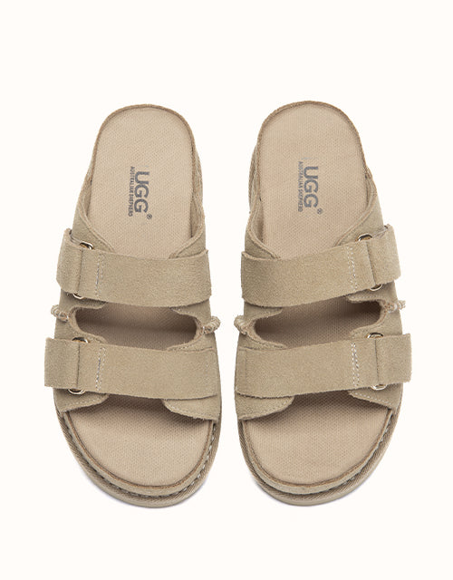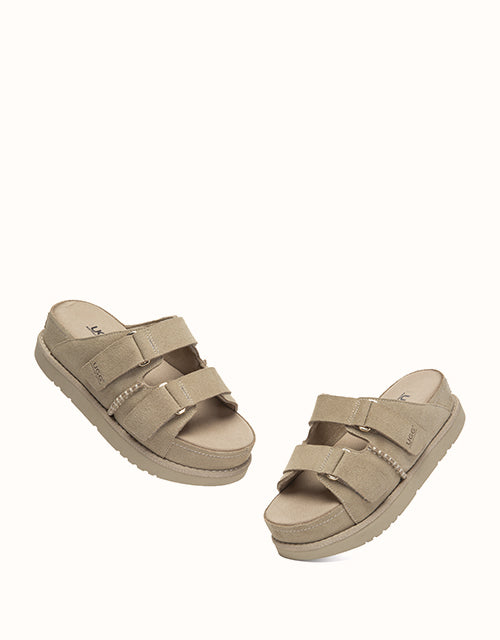 The Ventra Platform Sandals offer everyday comfort with a clean, minimal profile. Crafted from soft cow suede, the double adjustable straps provide a secure, custom fit, while the lightweight platform sole adds subtle height with stable support. Finished with a breathable fabric footbed, these sandals are an easy choice for relaxed daily wear and casual outings.