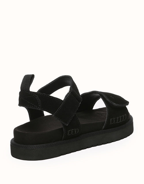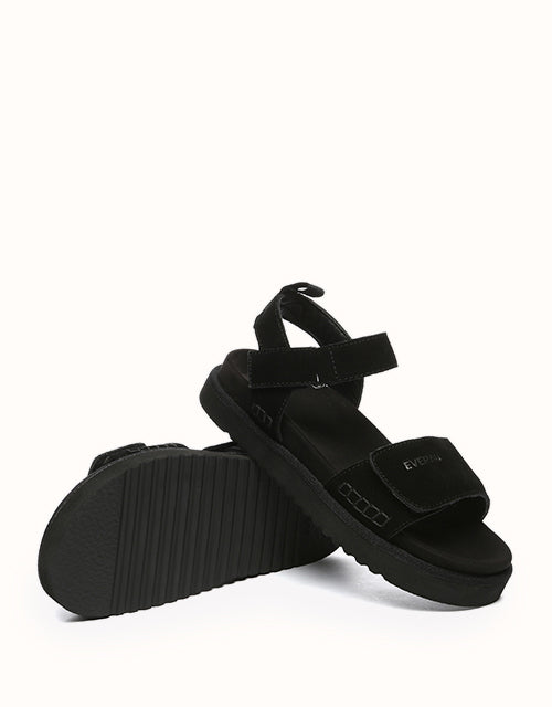 Featuring an open-toe design, these sandals combine adjustable buckle straps with premium leather for a touch of understated luxury. The hook-and-loop closures allow for effortless customization, ensuring a perfect fit across the instep. The suede-lined footbed is breathable and moisture-wicking, keeping your feet cool and comfortable even during extended wear. Built with a durable EVA sole, the boat-shaped base is designed for ultimate support, incorporating three strategically placed cushioning zones, reduces walking fatigue, and ensures every step feels effortlessly comfortable.