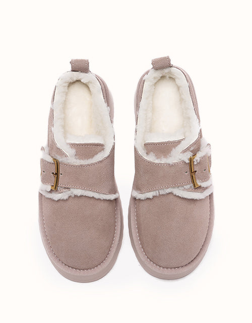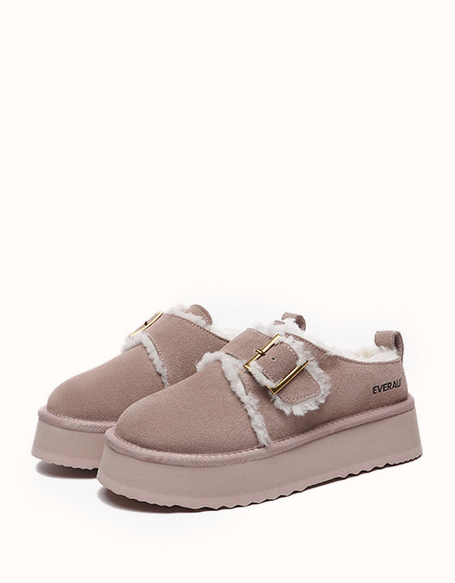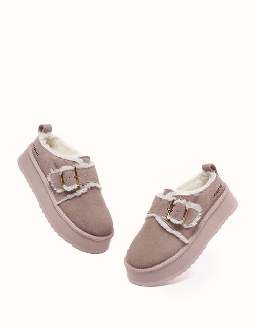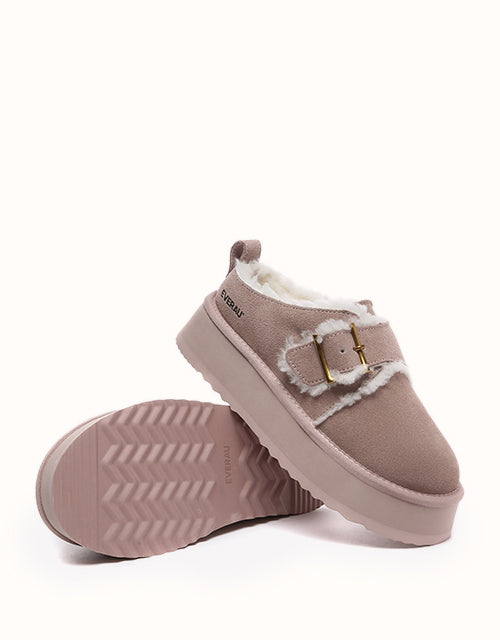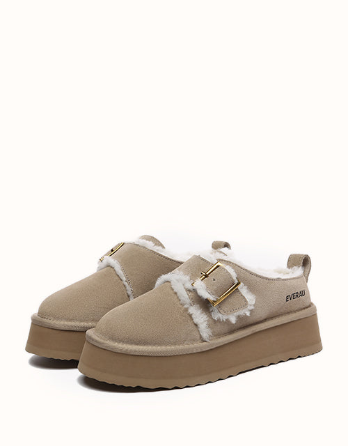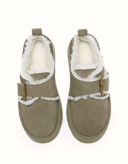 Effortlessly stylish and practical, these slip-on boots feature a shallow, slanted opening with an adjustable metal buckle and fuzzy trim, capturing the essence of autumn and winter fashion. Crafted from premium Australian Merino sheepskin, they offer breathable, moisture-wicking comfort and exceptional warmth with temperature regulation for year-round versatility. The 4cm EVA platform sole provides lightweight flexibility, memory rebound, and durability against scuffs, ensuring both elegance and functionality in every step.
