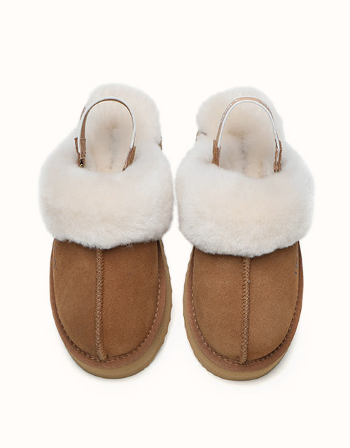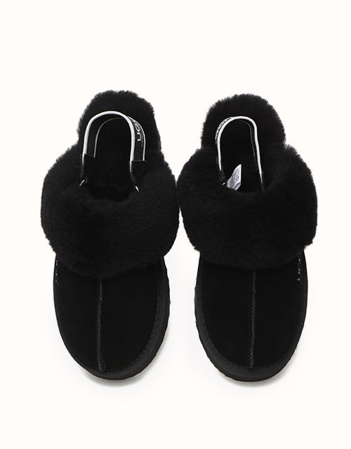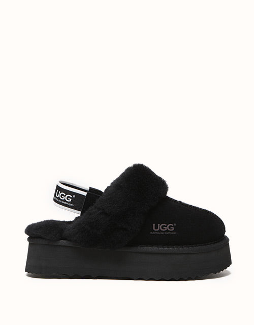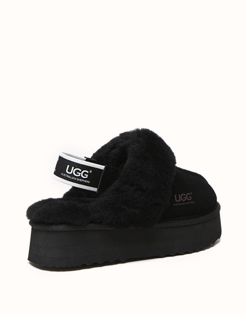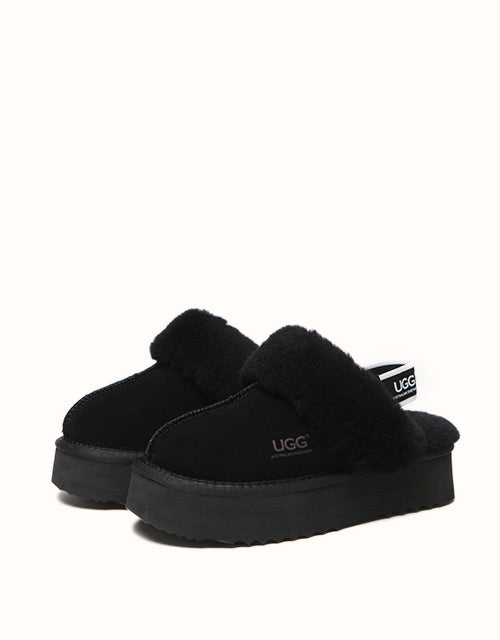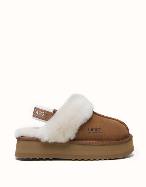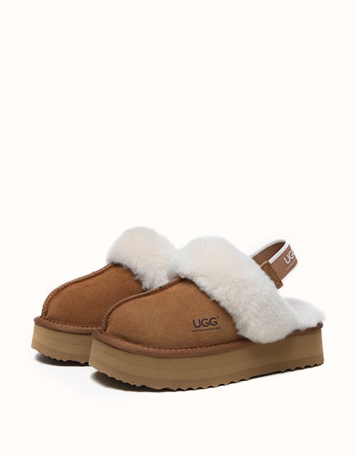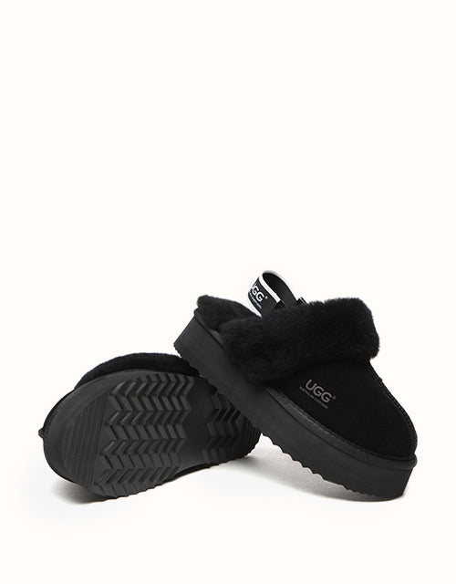 Now the platform ugg boot trend is available in our classic slingback style! The Australian Shepherd Muffin Platform Slippers are super stylish with their unique high-platform design. Lined with soft sheepskin wool, these slippers keep your feet cosy in the cooler months. The cow suede upper is treated with a nanotech coating that repels liquids and stains, making these slippers great for indoor and outdoor wear. The slingback style enhances breathability during the summer and the branded logo strap provides additional security when out and about. Pairing your outfit with these stylish slippers is sure to turn heads.