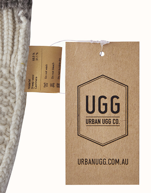 The Urban UGG Fluffo Hat delivers a modern twist on classic knitwear. Crafted from a premium wool–cashmere blend, it features a soft two-tone ribbed design that adds both warmth and contemporary elegance to winter styling.